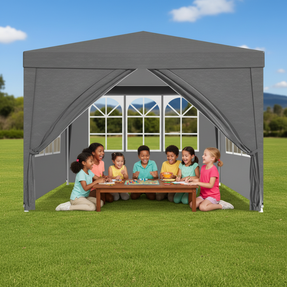 Acest model este potrivit pentru mese in familie, aniversari, relaxare in aer liber, evenimente sezoniere, zone temporare de umbrire sau spatii functionale pentru diverse activitati. Un avantaj important este faptul ca peretii pot fi montati, mutati sau indepartati individual, astfel incat pavilionul poate fi adaptat usor in functie de vreme, de spatiul disponibil si de preferintele utilizatorului.