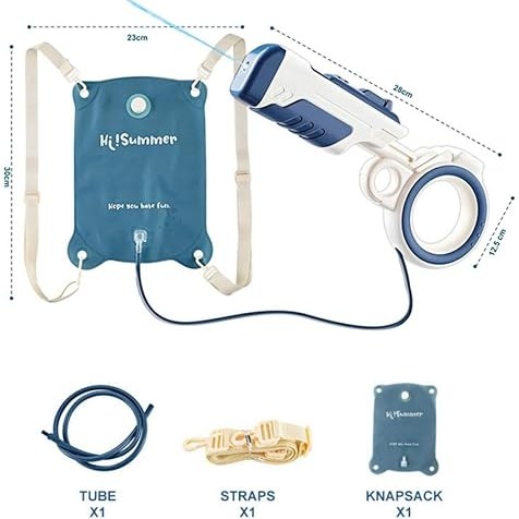 Continut set: 1 pistol cu apa, 1 rezervor tip rucsac, 2 curele reglabile, furtun de conectare