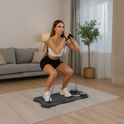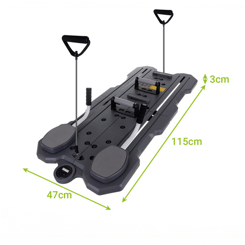 Pentru un plus de functionalitate, placa este echipata cu un afisaj LCD incorporat care iti permite sa monitorizezi progresul si cu accesorii special concepute pentru diversificarea exercitiilor: extensoare elastice, manere pentru flotari, cleme de blocare si un covoras inclus.