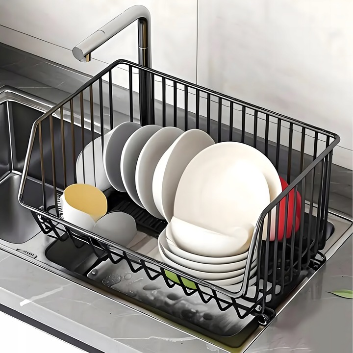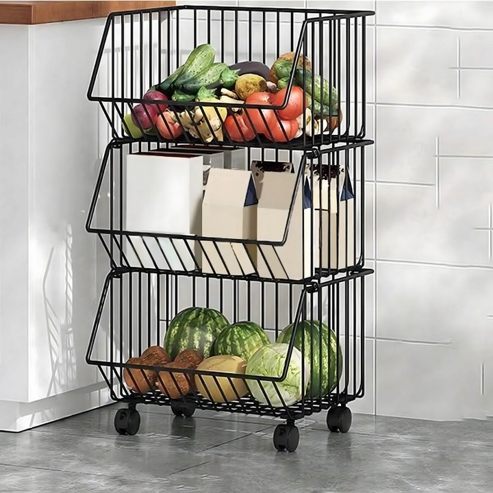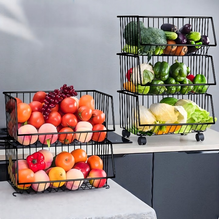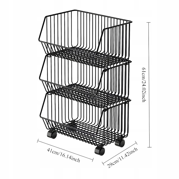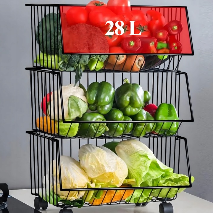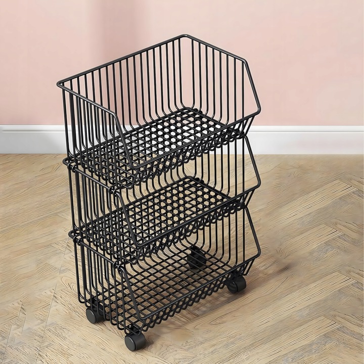 Raftul este prevazut cu 3 niveluri incapatoare sub forma de cosuri, ideale pentru depozitarea obiectelor de dimensiuni variate. Designul sau pliabil permite asamblarea si plierea rapida, fara unelte suplimentare, iar atunci cand nu este folosit, poate fi strans si depozitat cu usurinta. Suprafata metalica este rezistenta la umiditate si foarte usor de curatat, facandu-l perfect pentru incaperi precum bucataria sau baia.