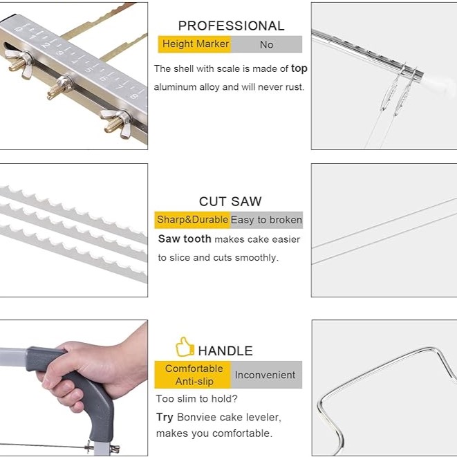 Fabricat din otel inoxidabil de inalta calitate, acest feliator este rezistent si durabil. Cele 3 corzi zimtate reglabile permit ajustarea grosimii fiecarui strat de blat, ceea ce il face mult mai eficient decat un cutit clasic. Datorita manerului ergonomic din aluminiu, feliatorul este usor de manevrat si iti ofera un control excelent in timpul utilizarii.