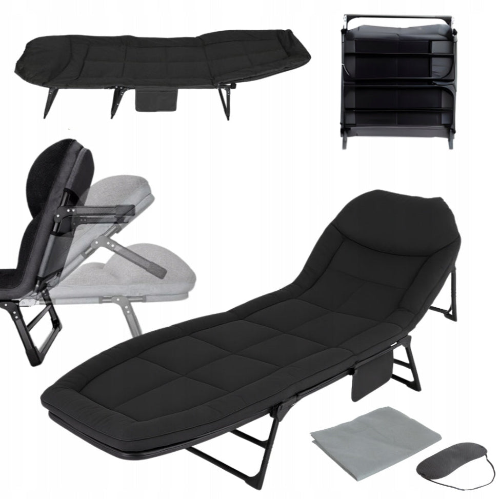 RESIGILAT-Pat pentru camping pliabil, Zola, reglabil in 5 trepte, greutate suportata 110 kg, saltea moale, mecanism de blocare, buzunar lateral, cadru fier, material Oxford, 193 x 66 x 31 cm, negru/gri