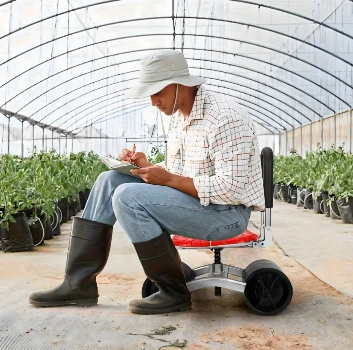 Scaunul este prevazut cu functie de rotire la 360°, ceea ce permite utilizatorului sa se miste liber fara a fi nevoie sa se ridice sau sa mute intregul carucior. Aceasta caracteristica il face extrem de util pentru gradinarit, unde este necesar accesul rapid in jurul plantelor sau straturilor de flori, dar si pentru activitatile din atelier sau garaj, cand ai nevoie sa te deplasezi rapid intre unelte.