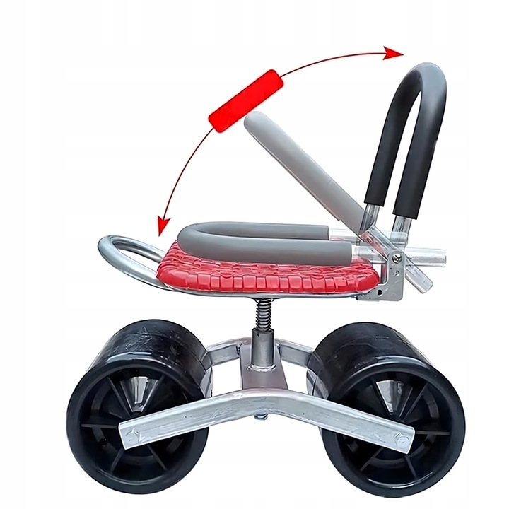 Scaun de gradinarit cu roti, Zola, rotire 360°, spatar pliabil, greutate maxim suportata 100 kg, otel/plastic, 46 x 32 x 25-35 cm, rosu