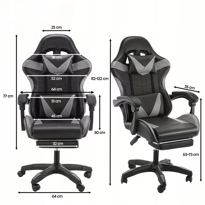 Scaunul se monteaza usor urmand instructiunile incluse in pachet – procesul dureaza aproximativ 30-40 de minute. Odata asamblat, poti regla inaltimea, unghiul spatarului si pozitia suportului pentru picioare in functie de preferinte. Utilizeaza pernele lombare si pentru gat pentru o pozitie ergonomica si confort pe termen lung. Este potrivit pentru gaming, munca de birou, studiu sau relaxare.