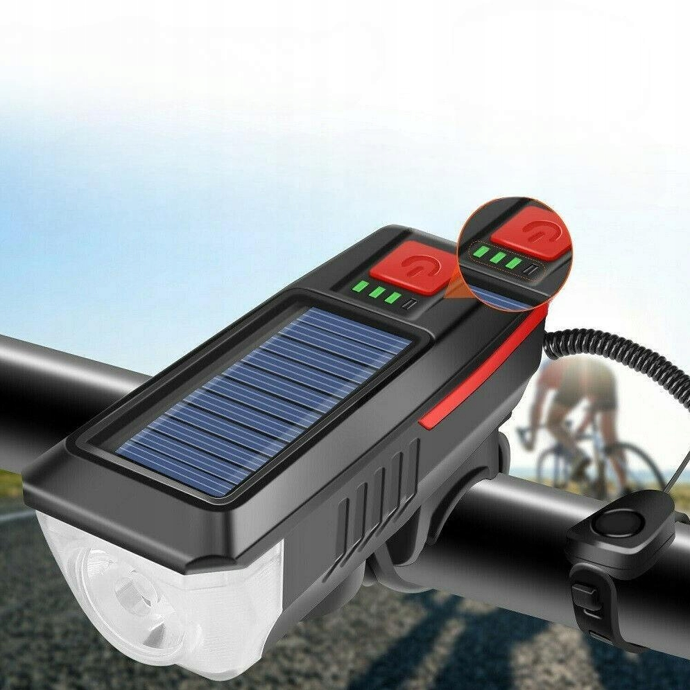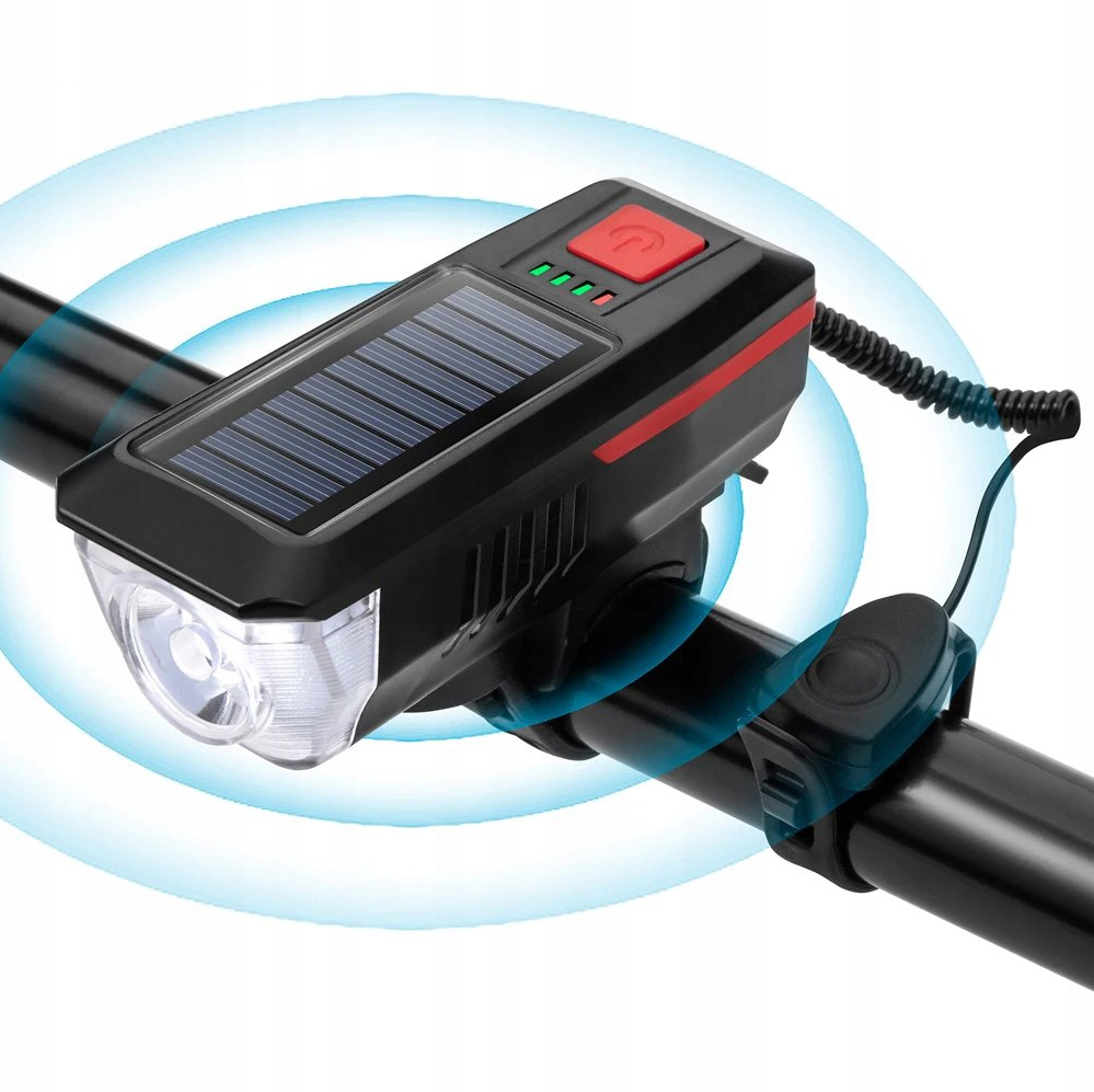Set far pentru bicicleta solar, claxon si semnal sonor, UBX, LED, 3 moduri iluminare, USB, 6 melodii, 11x3.5x4 cm, negru/rosu