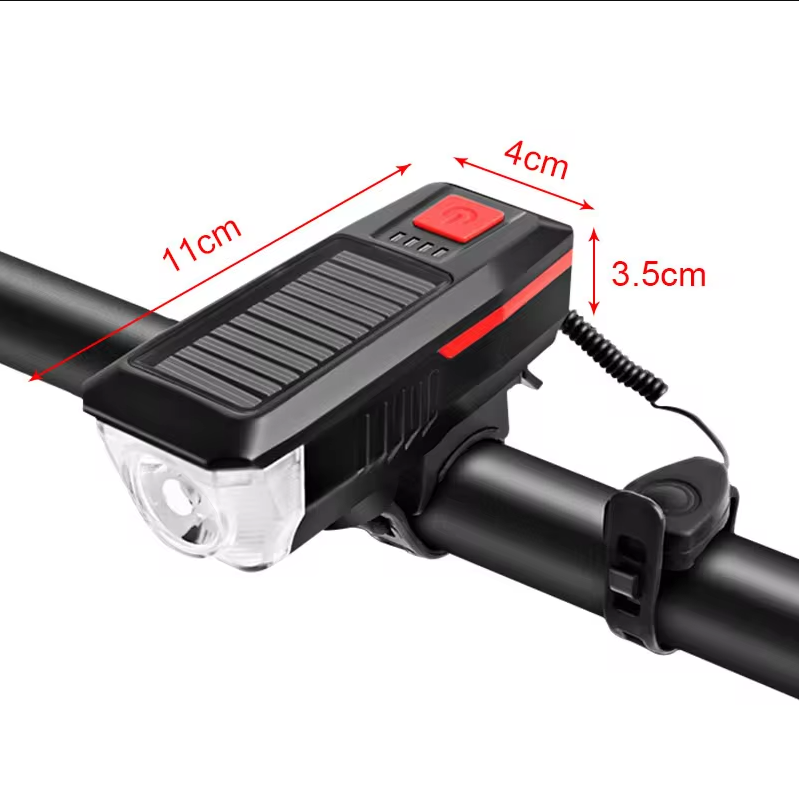 RESIGILAT-Set far pentru bicicleta solar, claxon si semnal sonor, UBX, LED, 3 moduri iluminare, USB, 6 melodii, 11x3.5x4 cm, negru/rosu