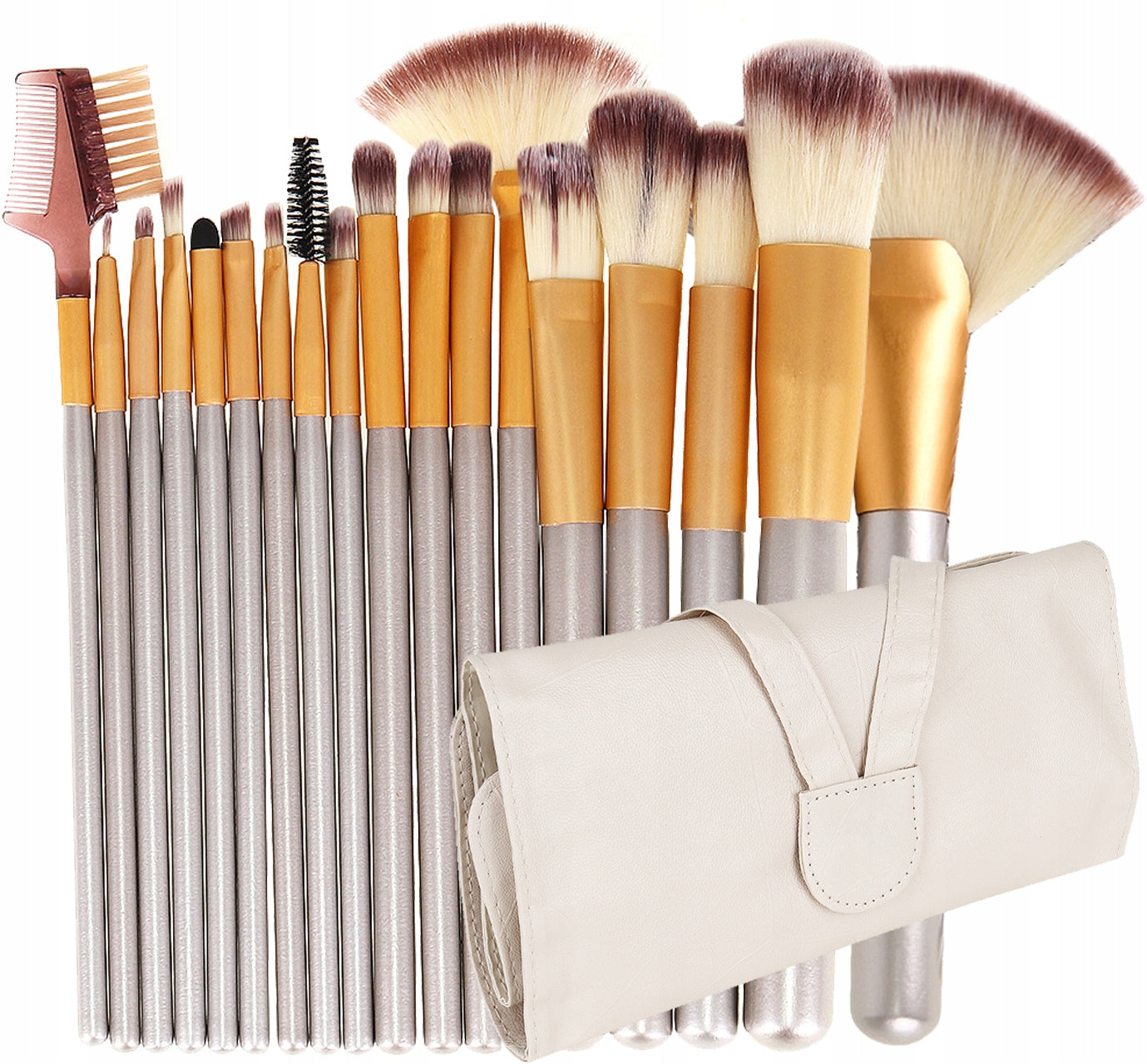 Set 24 de pensule pentru machiaj, UBX®, cu geanta pentru depozitare, crem, lungime 15-18.5 cm