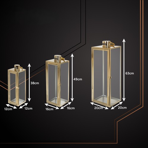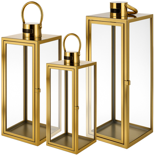 Set 3 felinare decorative din sticla, Zola, dimensiuni diferite 63 / 49 / 38 cm, otel inoxidabil, aurii