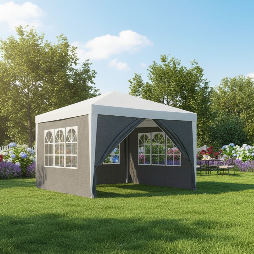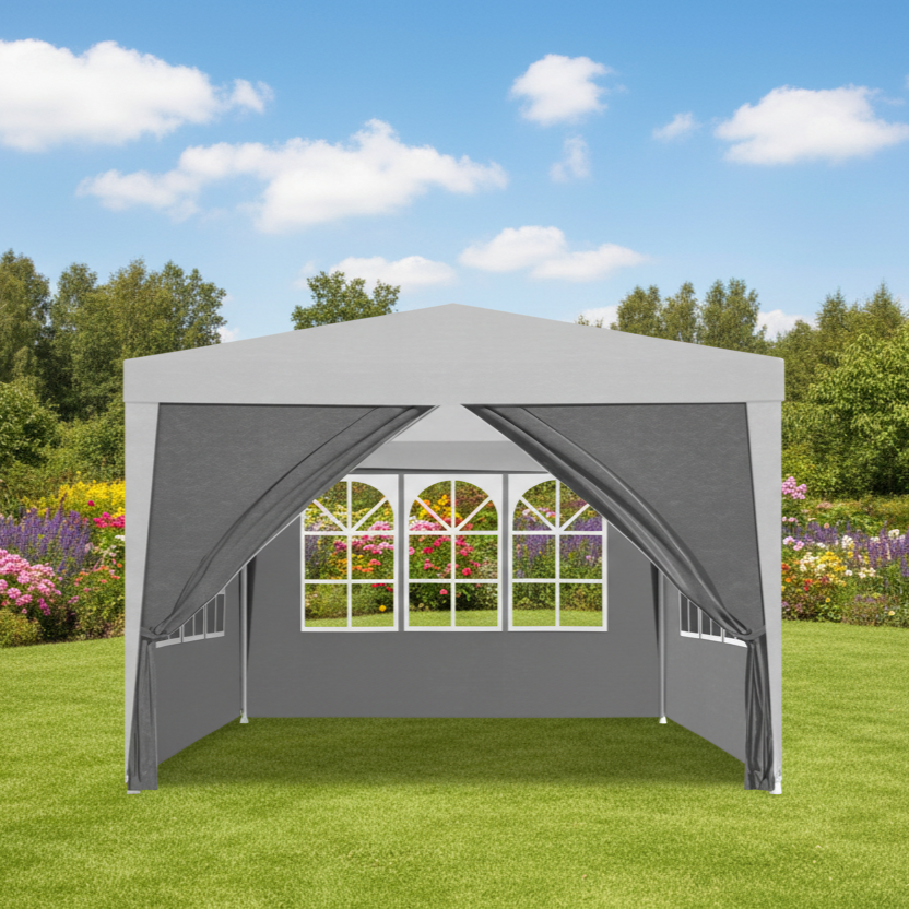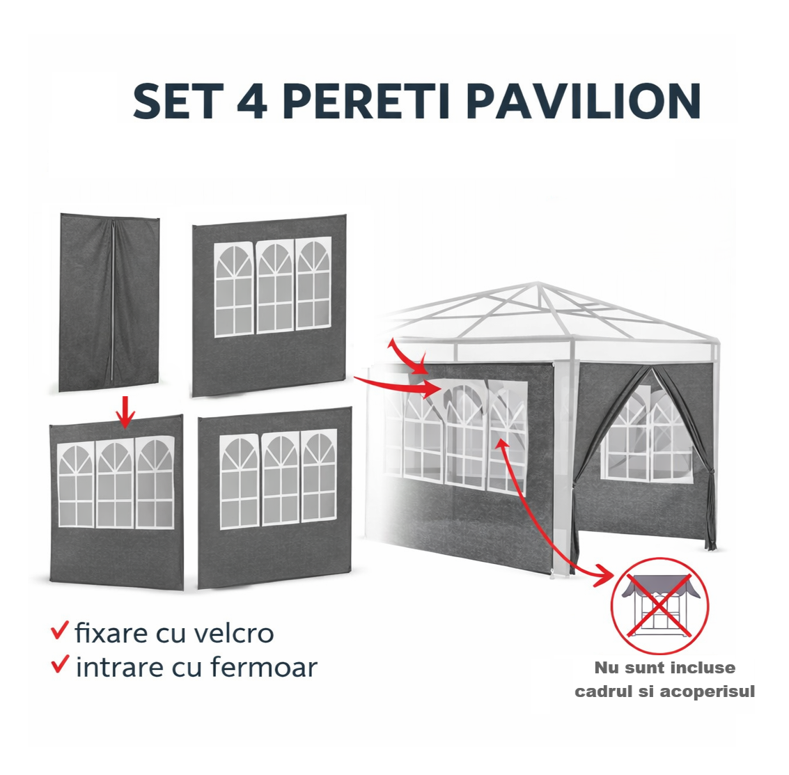 Lateralele sunt realizate din polietilena impermeabila de 100 g/m², un material usor, rezistent si potrivit pentru utilizare in exterior. Constructia permite montarea rapida si adaptarea pavilionului in functie de nevoi, deoarece fiecare perete poate fi montat individual, mutat sau indepartat complet. Fixarea lateralelor pe structura pavilionului se face rapid si simplu prin benzi velcro (arici), ceea ce permite instalarea sau demontarea usoara fara unelte.