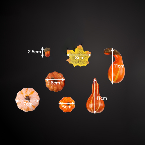 Fie ca doresti sa amenajezi o masa festiva, sa realizezi cosuri decorative, ghirlande, aranjamente florale sau sa adaugi un accent sezonier vitrinelor si rafturilor, acest set iti ofera toate elementele necesare pentru o decorare inspirata. Multitudinea de forme si dimensiuni iti permite sa combini piesele in mod creativ, rezultand decoruri unice si atragatoare.
