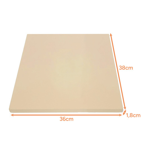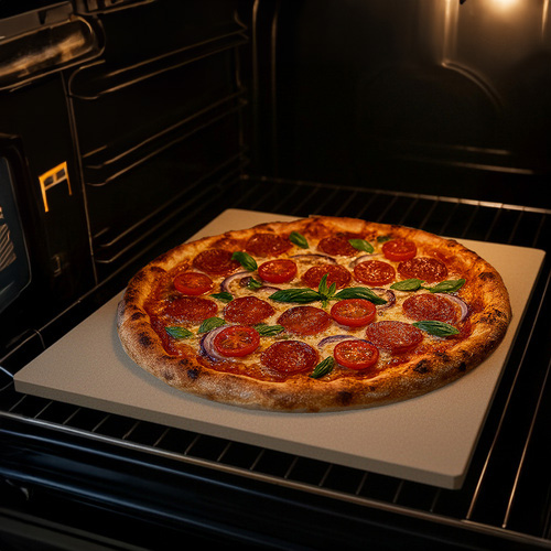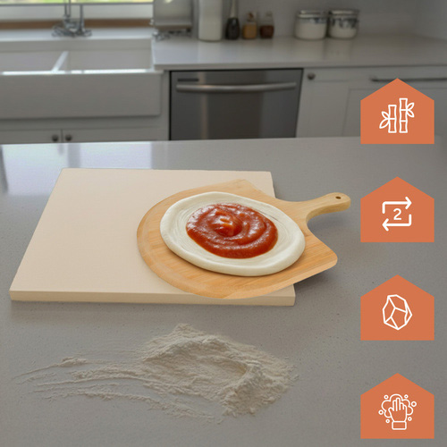 Piatra de pizza este realizata din cordierit masiv, un material recunoscut pentru rezistenta ridicata la temperaturi inalte si la socuri termice. Aceasta absoarbe excesul de umiditate din aluat, permitand coacerea rapida si uniforma a blatului, fara efectul de aluat moale sau insuficient copt. Grosimea generoasa asigura stabilitate si durabilitate in timp, chiar si in cazul utilizarii frecvente.