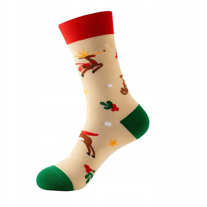 Modelul cu reni, brazi, stele si fulgi de zapada aduce spiritul Craciunului in garderoba de zi cu zi. Culoarea rosie cu accente galbene si verzi ofera un aspect vesel, potrivit pentru tinute casual sau pentru momente in care vrei sa porti ceva tematic si amuzant. Sosetele tematice sunt ideale pentru utilizare acasa, la birou sau in vizita la prieteni in perioada sarbatorilor.