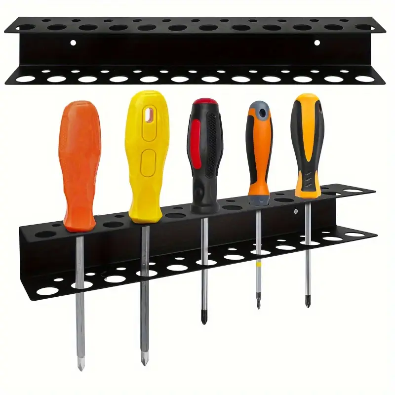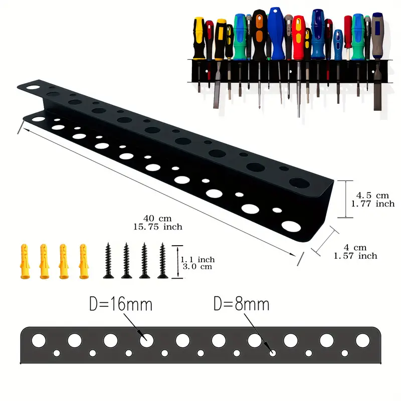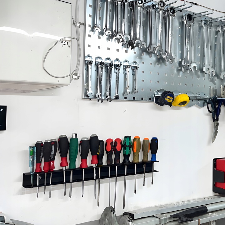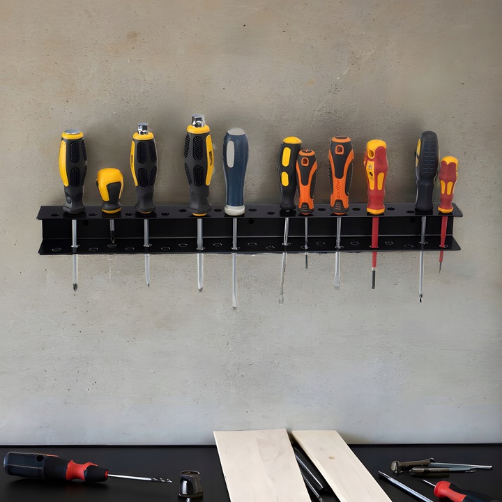 Suportul multifunctional de perete pentru unelte este solutia ideala pentru organizarea eficienta si profesionala a spatiului de lucru. Conceput special pentru ateliere, garaje sau spatii tehnice, acest suport robust din otel vopsit in camp electrostatic asigura o depozitare sigura si ordonata pentru toate sculele esentiale, de la surubelnite si clesti, pana la burghie, chei sau accesorii de montaj. Cu un design compact de 40 cm, se monteaza usor pe orice perete, contribuind la economisirea spatiului si la o organizare impecabila a uneltelor.