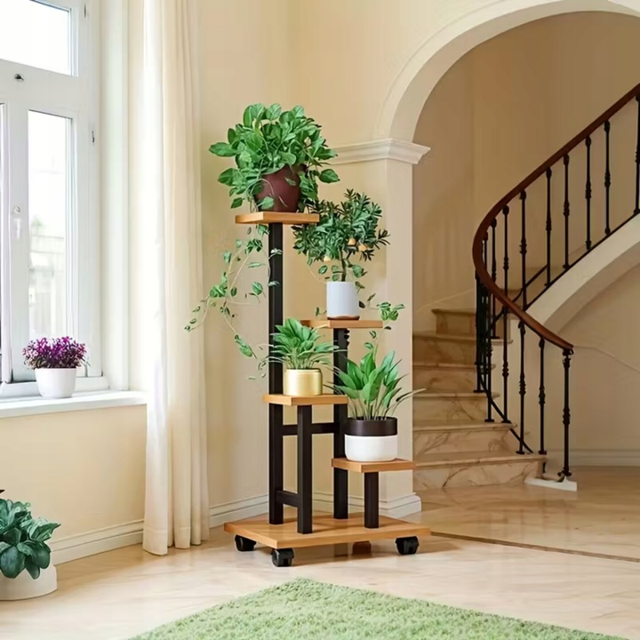 Suport pentru ghivece de flori cu 4 polite si roti pivotante este solutia ideala pentru organizarea si expunerea plantelor tale preferate, chiar si in spatii limitate. Designul vertical, modern si bine echilibrat iti permite sa aduci un plus de verdeata in casa, pe balcon sau pe terasa, fara a ocupa mult spatiu, oferind in acelasi timp mobilitate si stabilitate.