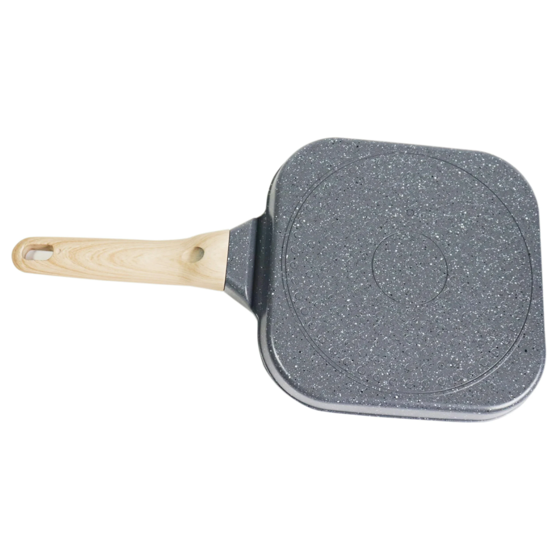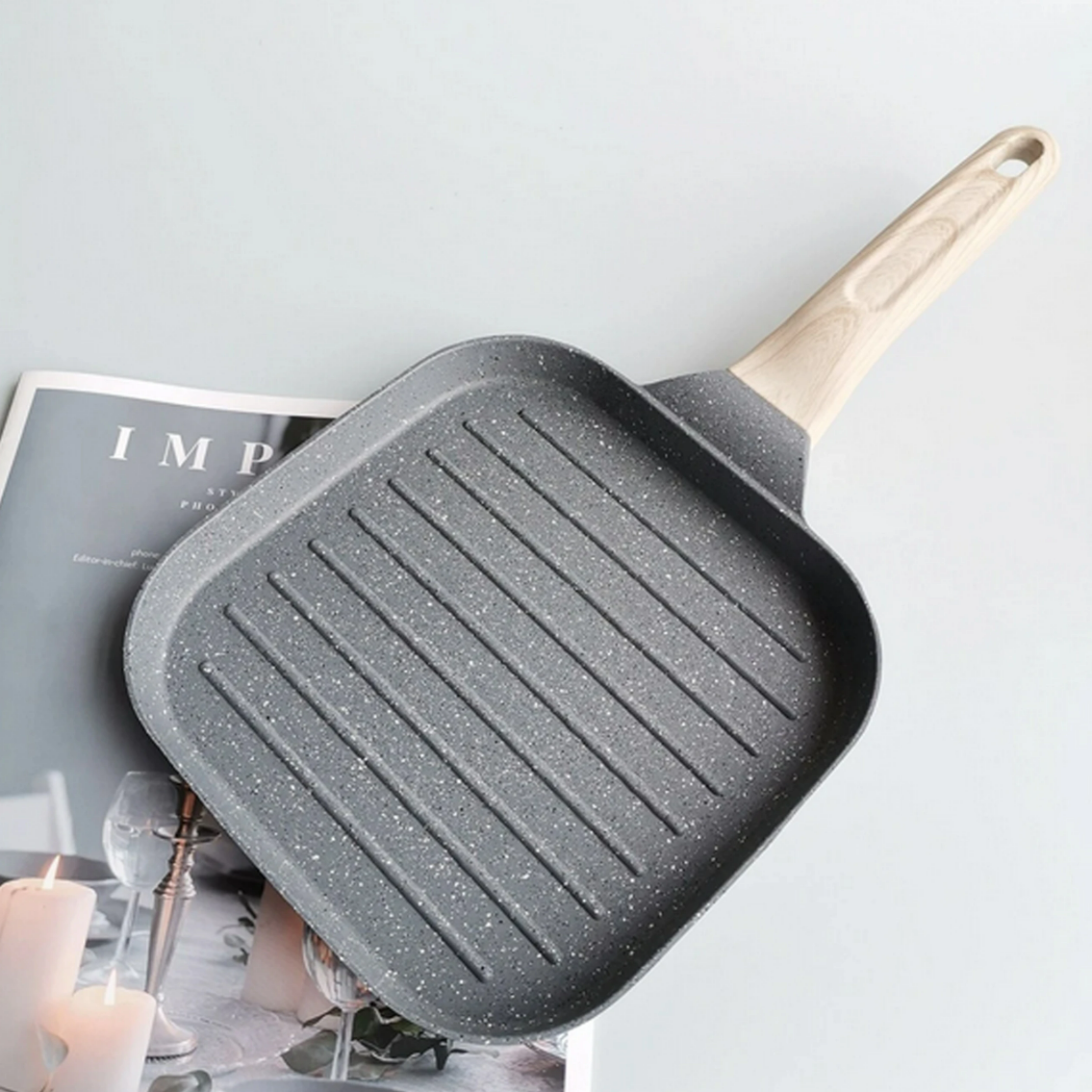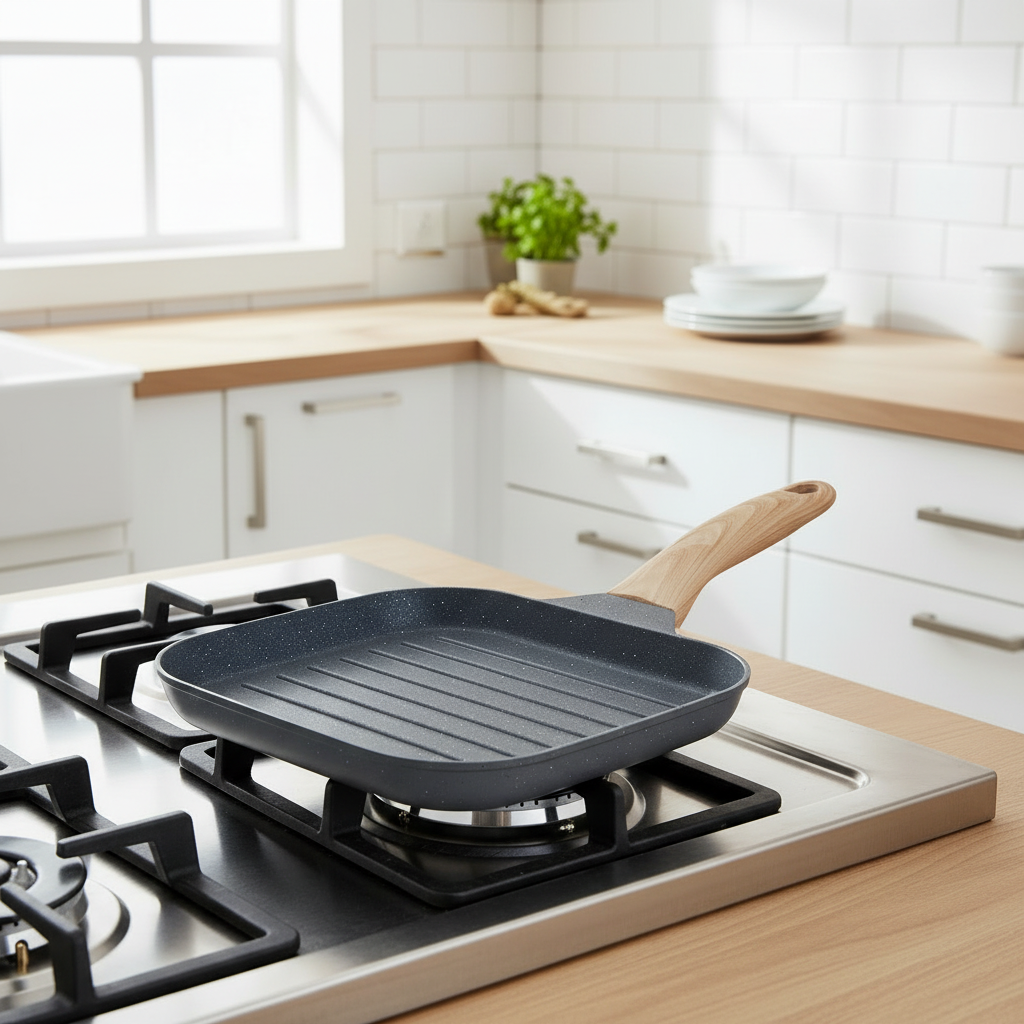 Aceasta tigaie grill patrata este conceputa pentru utilizare zilnica, fiind compatibila cu plita pe gaz, electric, ceramica, halogen si inductie. Baza distribuie uniform caldura, contribuind la economie de energie si la preparate gatite corect, fara zone arse sau insuficient preparate. Este ideala pentru oua prajite, clatite, chiftele, burgeri, mini omlete sau legume la grill.