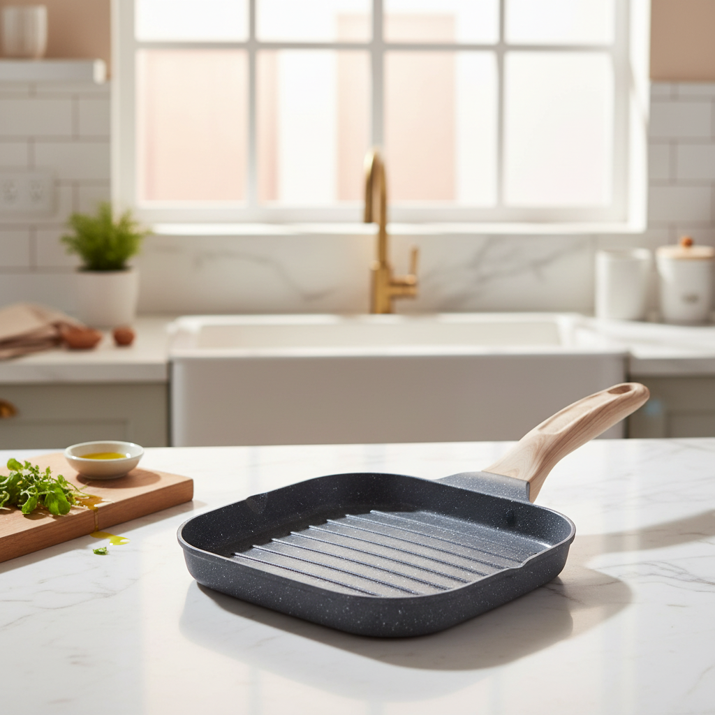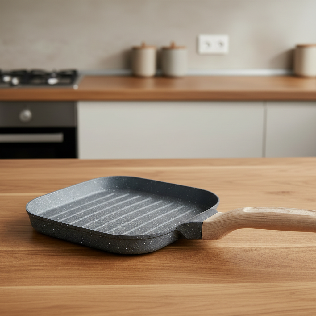 Tigaie antiaderenta grill din aluminiu este alegerea ideala pentru gatitul rapid si sanatos, indiferent de tipul de plita pe care il folosesti. Datorita dimensiunii compacte de 18.2 x 18.2 cm, aceasta este perfecta pentru portii individuale, mic dejunuri rapide sau preparate tip grill cu aspect apetisant. Stratul antiaderent tip granit permite gatirea uniforma, fara lipire si cu un consum minim de ulei.