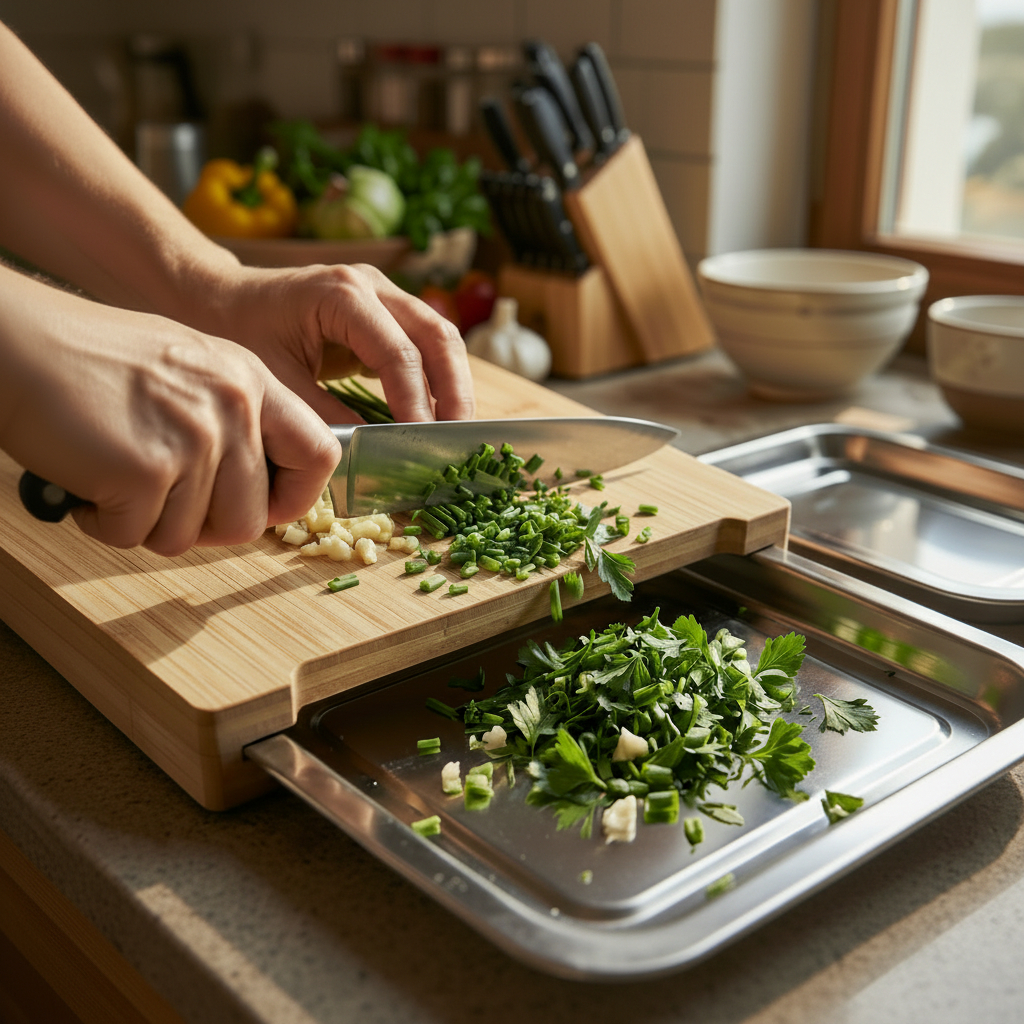 • Doua tavi extensibile din otel inoxidabil, care permit colectarea rapida a ingredientelor tocate sau a resturilor, reducand mizeria si facilitand transferul direct in tigaie, oala sau bol
