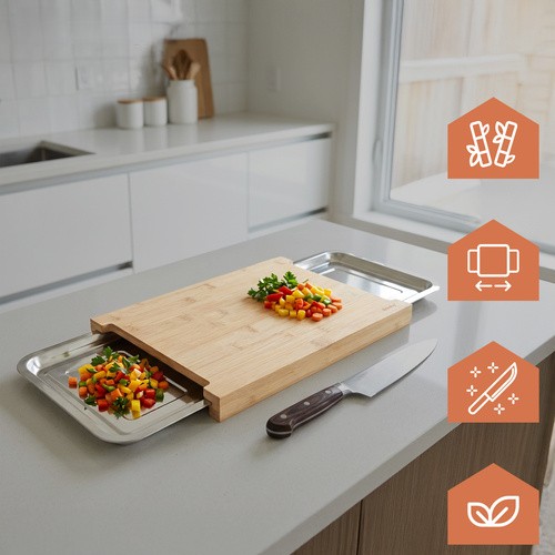 Tocatorul din bambus multifunctional este un accesoriu practic si elegant pentru orice bucatarie moderna, conceput pentru a face procesul de gatit mai rapid, mai curat si mai eficient. Datorita suprafetei generoase de lucru si a celor doua tavi extensibile din otel inoxidabil, acest tocator va permite sa tocati, sortati si transferati ingredientele fara efort, economisind timp si mentinand blatul curat. Este o solutie ideala atat pentru uz casnic zilnic, cat si pentru bucatarii profesionale sau restaurante.