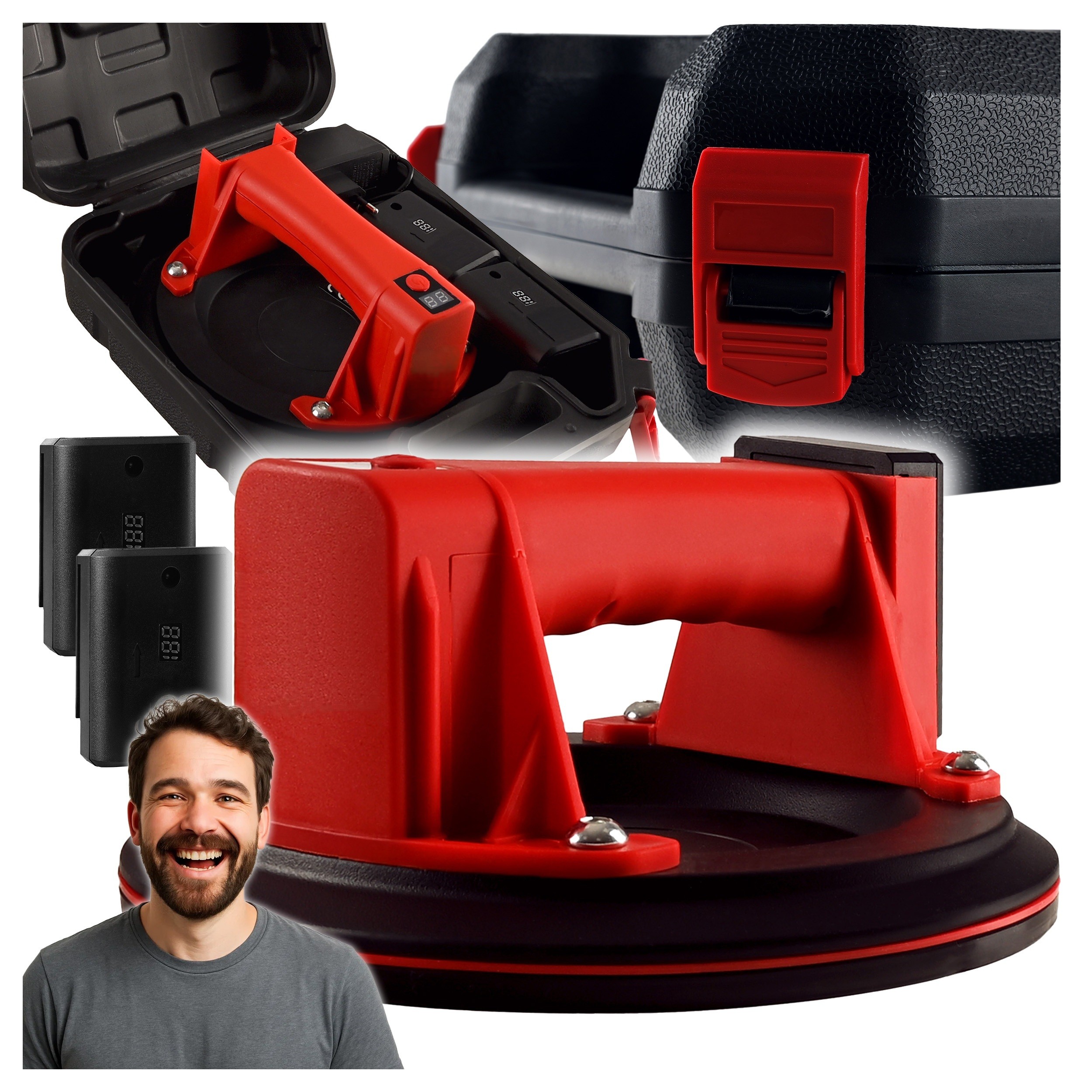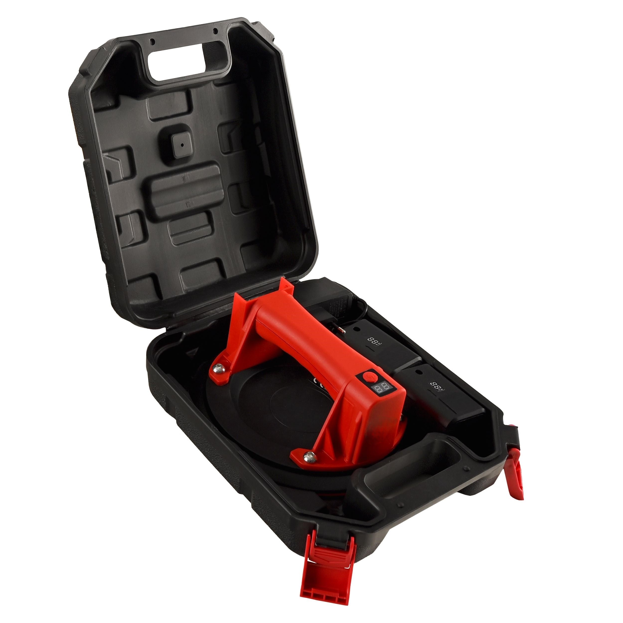 Ventuza cu pompa vid pentru manipulare placi, Zola, forta aspirare 200-300 kg, diametru 20 cm, alimentare acumulatori 2400 mAh, carcasa depozitare, rosu/negru